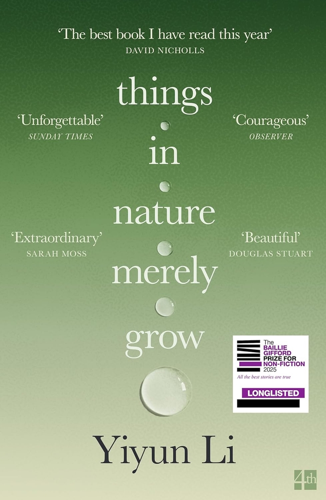 This is a book for James, but it is not a book about grieving or mourning. As Li writes, “The verb that does not die is ‘to be.’ Vincent was and is and will always be Vincent. James was and is and will always be James. We were and are and will always be their parents. There is no now and then, now and later; only now and now and now and now.” Things in Nature Merely Grow is a testament to Li’s indomitable spirit.